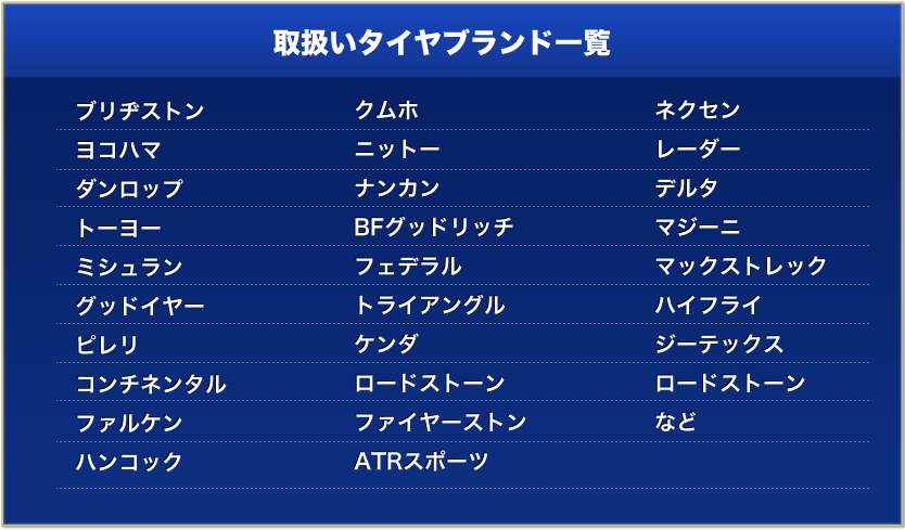 取り扱っているブランドタイヤブランドは下記ですが、ご希望されるタイヤの在庫がない場合は、お取り寄せも可能です。(ご用意できるまで1週間から2週間程度かかります。)